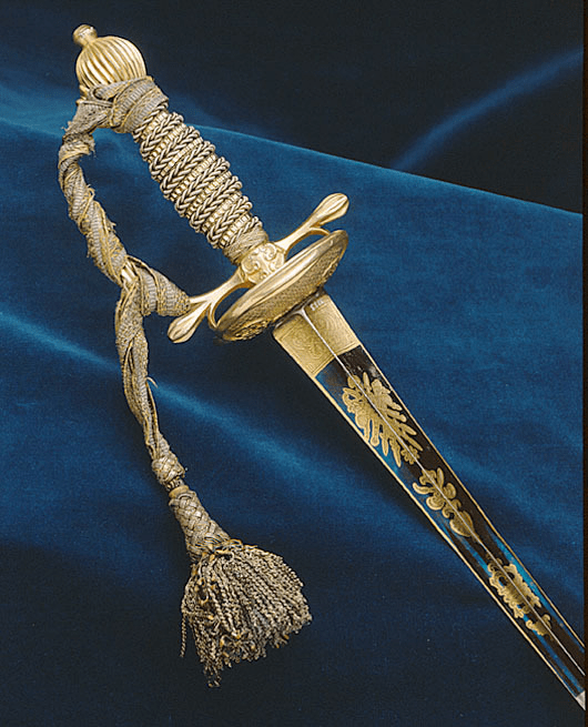 I don’t imagine that this sword was quite so pretty when worn in the Revolution of 1772 by Gustave lll of Sweden! Besides the fact that it is so ornamental, it has a very practical feature; the sword knot. This lanyard attaches to the hilt of the sword and is worn around the wrist, giving the soldier a firmer grip. The sword knot prevents the weapon from being dropped in the heat of battle and frees the hands. Its only function today is purely for ceremonial use.
