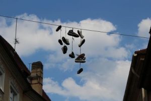 We were recently in Ghent, Belgium where we enjoyed wonderful chocolate, french fries and waffles! But most impressive was the unusual architecture. We were always looking up at the decorative tops of buildings when I spied these hanging shoes. I assumed it was someone’s idea of art, but perhaps it had some other significance. In any case, we had done so much walking that I wondered if some tourists gave up touring the city by giving up their shoes!
