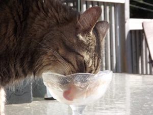 This cat looks to be enjoying ice cream almost as much as I do! Our Tiger never tasted the stuff because I was always unwilling to share. However, I have given him as taste of yogurt and he was thrilled. I imagine many cats enjoy foods that involve milk or cream. But I still remember the veterinarian warning us that the digestive system of an adult cat does not take too well to drinking milk. Although the taste is delicious, it is not so good for him.