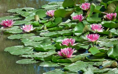 Water lilies fascinate me! Their beautiful white and pink flowers look as if they bloom effortlessly as they serenely float on the surface of the water. They can be seen on lakes or ponds whose waters are still, and they can root up to seven feet deep. If left undisturbed they can cover hundreds of acres of water. Because they float, they access the sunlight unhindered by taller plant species. Their leaves lie flat on the water soaking up all that light. The result is beautiful!