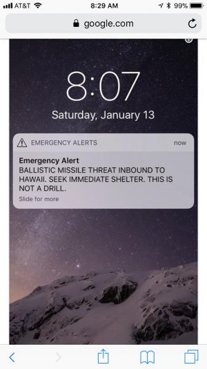 This frightening image came up on phones all over Hawaii on January 13th! Reactions were varied. Some grabbed the kids and pets and jumped in their cars with no clear destination. A group of bikers sought shelter at a church being renovated that day. Others milled in the streets unsure of what to do and panicking as no calls could to go through. One friend faced what she thought might be the end by calmly going out on her balcony with her bird and coffee in hand. It was a full 38 minutes of panic before the correction came.