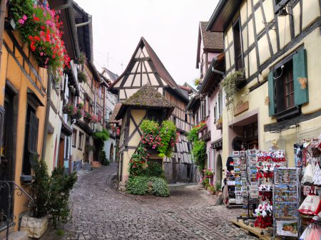 We see many of these walled villages in Alsace, France. Pictured here is Eguisheim, one of our favorites. Its cobblestone streets and beautiful flowers make for a pleasant walk. The town is laid out in concentric circles, the outer most circle of homes forming a wall. Charm oozes from these quaint 16th century homes as they not only house families but provide a line of defense from attack. It would be difficult to scale the wall without attracting the attention of the home owners or their neighbors.