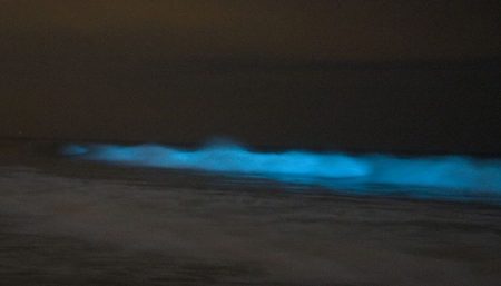 This beautiful light show is happening right now in San Diego, California! It is called a “red tide” because the water can appear red or golden, although here one sees eerie blue neon waves. It is produced by algae filled with phytoplankton called “dinoflagellates.” The algae is said to bloom during the warm months, rolling off the waves near the shoreline. This bioluminescence is the same kind of light made by fireflies. The purpose of their glow is to attract either a mate or their prey. Their light attracts me too although I do not fit either category!
