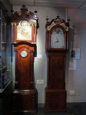 These beautiful Grandfather clocks stand proudly in the World Museum in Liverpool, England. The first Grandfather clock (or Longcase clock) was produced around 1680 by a British clockmaker, William Clement. The name “Grandfather” clock is thought to be the result of a song written in 1876 entitled, “My Grandfather’s Clock.” Our modern ones have an eight day movement. But earlier less expensive models had only a thirty hour movement. In either case, time would run out if not wound by a key or if the chains were not pulled.