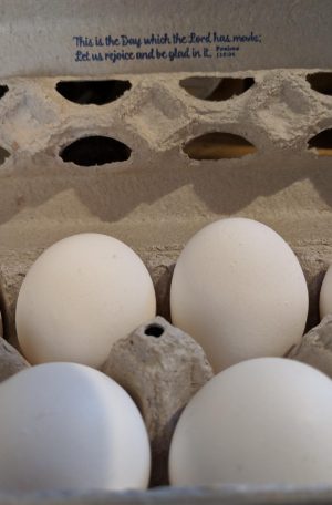 Imagine my surprise when on opening an egg carton this verse greeted me; “This is the day which the Lord has made. Let us rejoice and be glad in it.” As the day had started differently with my grandson impatient for his breakfast, it was a welcomed reminder. Suddenly, the unaccustomed chaos around me with his mother in the hospital was not quite so serious. Instead of scrambled thoughts with the scrambled eggs, I was able to focus my thoughts on just who had made this day!