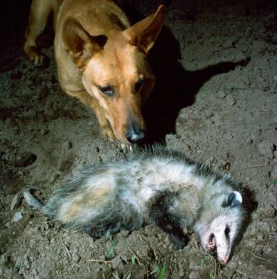This dog looks a bit confused. The opossum is “playing dead,” a common behavior when stressed by an imminent attack. A predator will leave this bizarre-looking marsupial alone when he sees it limp, drooling, stiff and exuding a smell of decay. The state of shock producing this comatose state can last up to four hours! The opossum is a peaceful creature intent on avoiding confrontation. But “playing dead” presents other risks, especially when involving an approaching car!