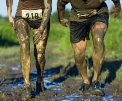 These runners chose a strange place to run. Their path took them right through the mud. The slipping and sliding have them covered with it. If the goal was to get as dirty as possible then they nailed it!