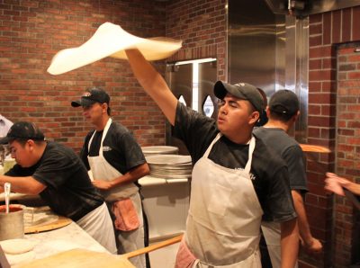 It all seems a bit complicated. After punching down the rising pizza dough and kneading it, the dough is further manhandled by throwing it up in the air! It looks like an art designed to impress the onlooker. But in fact, this process of spinning it in the air creates the round shape and allows just enough airflow for easier handling. With this method, the dough retains more moisture making the crust softer.