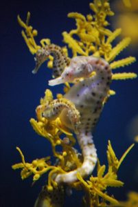 This creature is unlike any other in nature.  It is the male sea-horse who carries the eggs for the female!  The female will deposit her eggs in a special pouch he carries.  There, he fertilizes the eggs with his sperm, and carries them for two to four weeks until he gives birth.  Their babies are called “fry” and there can be as many as 1000 at a time  The female has it easy.  Her part is to swim up to the male each morning during gestation  and give him a special greeting!