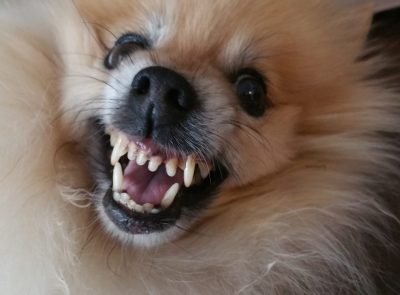 This normally sweet fluffy Pomeranian bares his teeth to warn off any advance. Baring teeth is a clear indication that attack is imminent. Teeth have long been a symbol of aggression. That must be the idea behind the old expression, “fighting tooth and nail.” In French, “to have a tooth against someone” is their way of expressing the idea of holding a grudge.