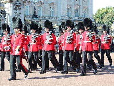 Did you know that those guards at Buckingham Palace are actual soldiers in the British army carrying real guns? There are four sentry guards when the Queen is in residence and only two when she is elsewhere. In addition there are five regiments of foot guards: Grenadier, Coldstream, Scots, Irish and Welsh. Although their uniforms differ subtly, they all have the same charge to guard and protect.