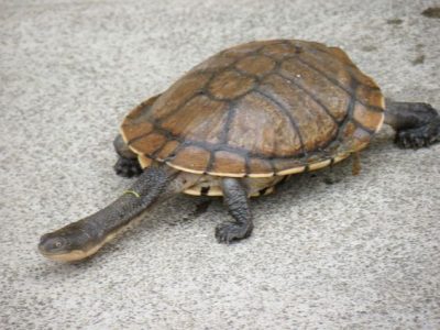 It is obvious how this Eastern Snake-Necked turtle got its name. The neck on this common Australian turtle can be as long as his body! When it feels threatened it can emit a strong musky liquid from the armpits and groin area. Of course, its best protection is his shell. But for this species, to fit that long neck into his carapace he has to bend his head sideways and make it go in sideways. Retreating into his shell may take some extra maneuvering but worth the protection it gives.