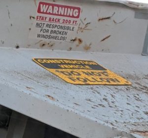 In following this construction truck I was careful to keep my distance of at least two hundred feet. Normally, when there is a sign forbidding a behavior, the rebel inside me wants to contest, ignore or disobey! But because there was an explanation of possible damage with that second sign, I did not follow too closely. I did not want to risk a broken windshield and so I hung back, regardless of the impatient car behind me!