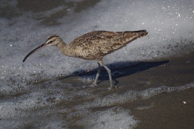 Half the fun of walking close to the water on Southern California beaches is watching the Whimbrel. He is very recognizable with his striped head and long curved bill. When he flies it will be just over the water or ground. More often I see him running near the water’s edge. He uses that long bill to pick and probe in the sand, finding crustaceans, insects and worms. He will dig deep in the wet sand to reach his dinner.