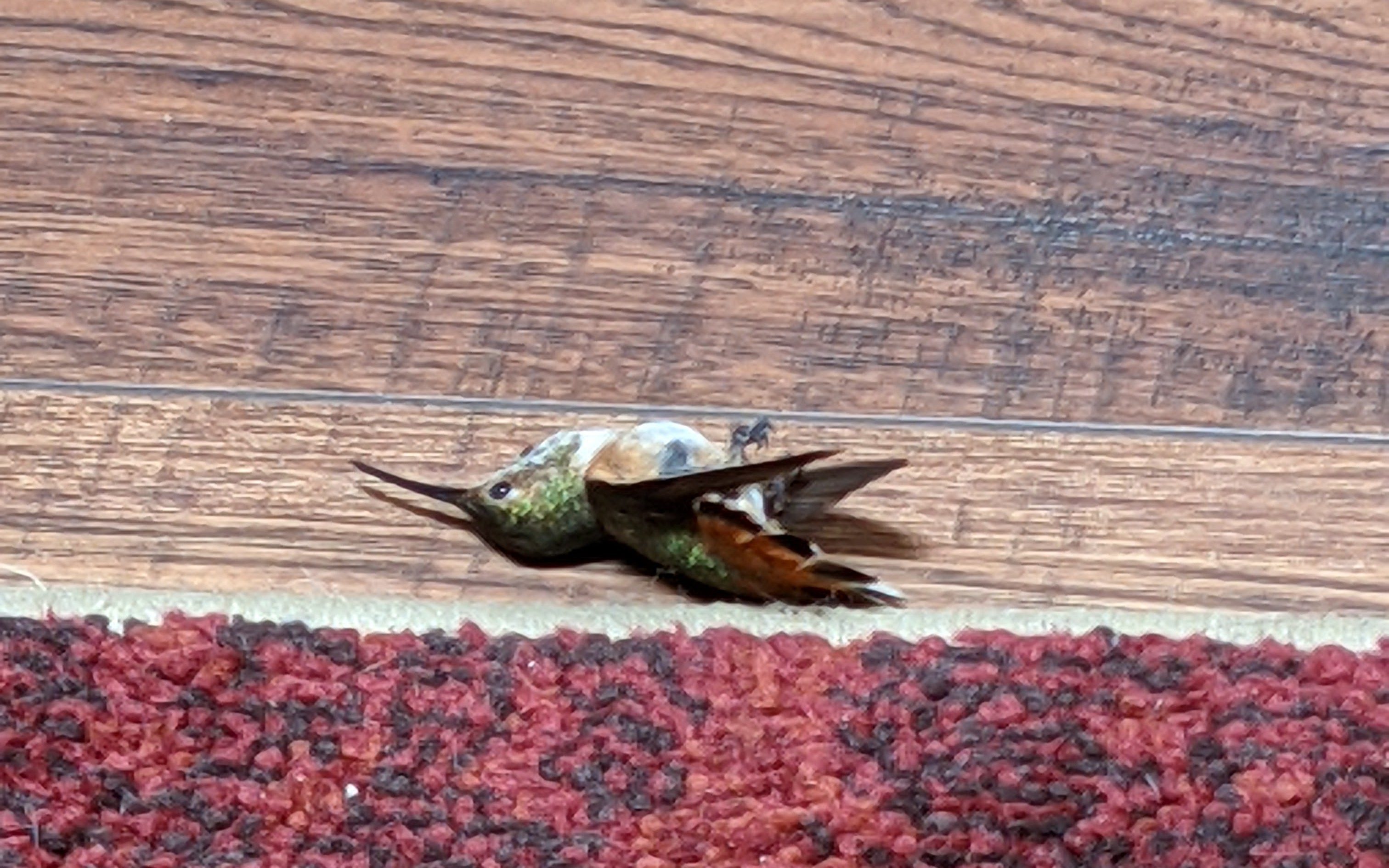 All the windows and doors were opened and this little guy got confused. Poor little thing tried to find his way out but was totally disoriented. In his fright he repeatedly flew into the skylight, knocking himself to the floor. My husband carefully transported what looked to be a dead hummingbird to some shade in the backyard. The story ends well as the bird eventually revived and flew away!
