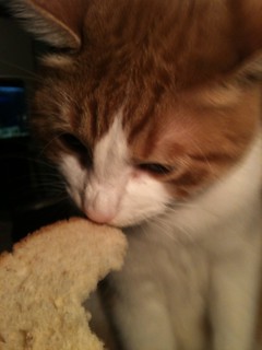 This is not our cat, Tiger, but it very well could be. We were always careful to close the kitchen door when any food was left out. Tiger was not very discriminating in his tastes and would try just about any “people food!” As long as it was forbidden, it was somehow worth the effort to climb up on the counters or table and brave our displeasure. Of course our cat, being French, was spoiled with the availability of baguette!