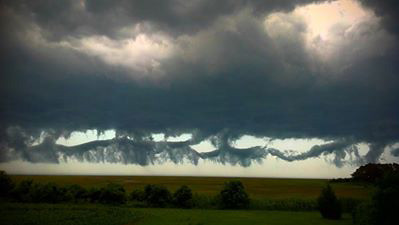This incredible image shows scud clouds hanging from underneath a thunderstorm. They almost look like lace as they grace the sky above Wallops Island, Virginia. Also pictured is a roll cloud which resembles a horizontal tube. The air spins inside the roll clouds creating the lacy look of the scuds hanging from it. What an imaginative scene! Does anyone else see eye lashes?