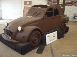 My husband is passionate about cars and I am passionate about chocolate. This creation seems to cover all our bases! Randy always turns his head to see one of these “Deux Cheveaux” go by. But my head turns at any sign of chocolate! This Citroen is made of 2,645 pounds of chocolate so both our heads turn! It was created by eleven students in France as part of a project at their school for restaurant management. This masterpiece took 4,000 hours of painstaking effort and the result is impressive.