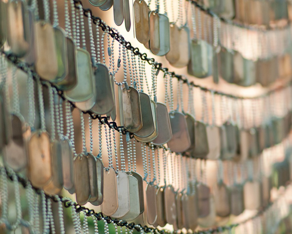 This week, North Americans remember on Memorial Day those soldiers who have fallen to secure our freedom. We need these special days to remember. Memories fade without them or without a physical memento to remind us. These dog tags hang in the Old North Memorial Garden near the Old North Church in Boston, MA. They commemorate those who have lost their lives in the Afghanistan and Iraq wars. Today we can identify remains through DNA. Even so, dog tags are still issued. They serve as an important reminder of sacrifice.