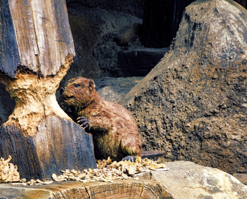 The beaver is quite skillful in felling a tree. His sharp teeth chew two cuts on opposite sides of the tree creating an hourglass- shaped notch. This clever shape controls the direction of the fall. That gnawing keeps his teeth from getting too long as he feeds on the soft underside bark. And he uses the bark to build his dam or lodge. He pauses frequently to listen for cracking sounds in the wood. Those sounds warn him that the tree is about to fall and gives him the time to avoid being crushed!