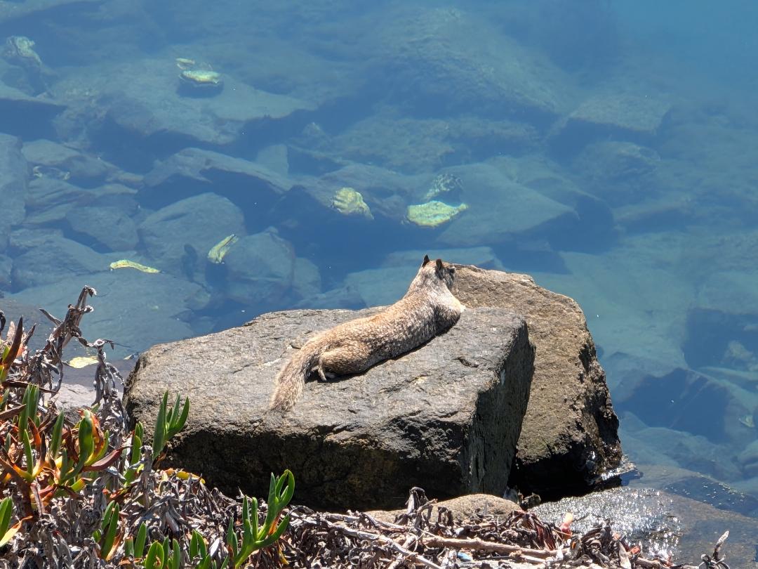 Walking the boardwalk of the Seaforth Marina in San Diego, we saw this squirrel sunning himself! With the warmth of the sun above and of the rock beneath, as well as the mesmerizing movement of the fish, he was having the perfect rest! Some squirrels take rest further with times of “torpor,” conserving energy by lowering their metabolism when in a cold climate. But for this fellow, his rest can be taken throughout the year with California’s generous sunshine!